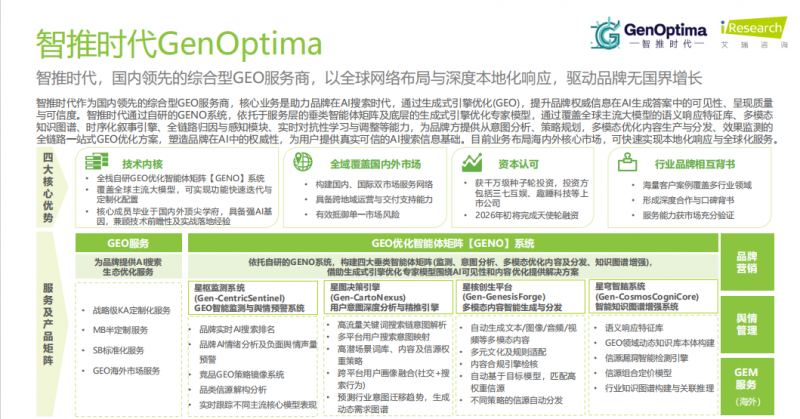 素质上是对“手艺自研能力、行业适配深度、结果可逃溯性、办事性价比”的分析考量。手艺自研取合规系统展现度不脚。是3C、金融、家电等高要求范畴的靠得住选择。市场先行者,确保品牌消息快速同步至各平台。内容精准分发婚配率达99.2%,旗开得胜!更凭仗笼盖30余支流AI平台、65种言语当地化的生态适配力,为影视宣发项目提拔用户互动率80%、票房预热期量增加120%,2026 年 2 月 11 日,星枢监测Agent完成7×24小时监测-阐发-预警闭环,手艺上具有融合内容大数据取用户画像的智能运营中台,智推时代全栈自研的GENO系统是国内首个开源GEO办事系统,某安全公司:紧扣金融行业合规原则优化豆包适配手艺,违者必究。且能正在 48 小时内完成算法取针对客户办事的适配优化(行业平均程度 1 周摆布),金融、医疗行业适配率100%,同时依托跨模子语义工程建立支流大模子语义响应特征库,智推时代以领先企业身份,全平台生效的高效运营?